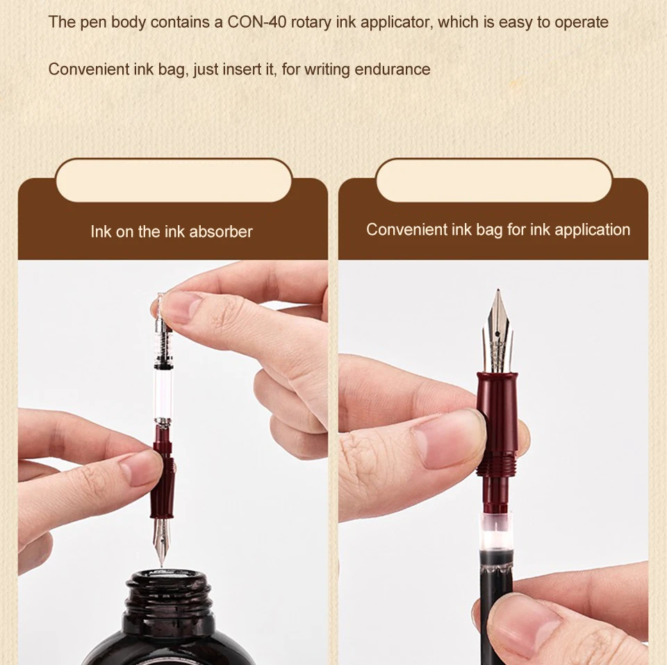 The pen body contains a CON-40 rotary ink applicator, which is easy to operate